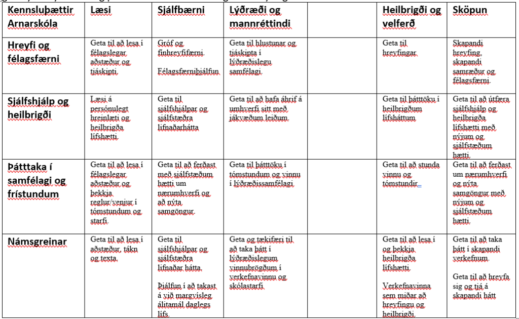Yfirþættir í námskrá Arnarskóla eru feitletraðir í meðfylgjandi töflu